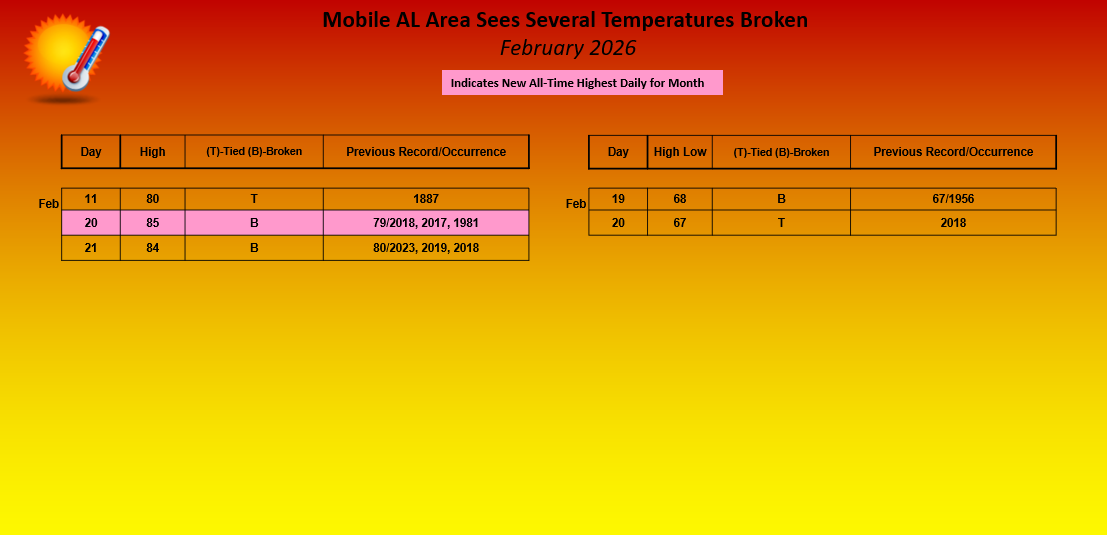 February 2026 in Review - As is typical of the cold season, February saw extremes about the climatological means in both temperature metrics, that being daily highs and lows. From an average perspective, temperatures for the month were above normal at Mobile and Pensacola. In fact, Mobile's average monthly high of 70.0° stands in the top ten warmest February's on record tying at number eight with the last occurrence a year ago. To start off the month, it was on the cold side of climatology mostly in low temperatures for the first week from the 1st to the 8th, when daytime minima averaged 11.8° below normal at Mobile and 10.6° below normal at Pensacola. Temperatures moderated and becoming steady state above normal from the 9th to the 21st where highs and lows through the period averaged 10.2° above normal and 9.2° above normal respectively at Mobile. During this stretch three record highs and two record high low temperatures were matched or broken at Mobile. The high on the 20th of 85° tied for the warmest daily temperature in February with the other occurrence, not long ago on February 8th, 2023. For the same period, Pensacola's highs and lows warmed, averaging 7.8° above normal and 9.4° above normal respectively. During the same stretch three record highs and one record high low temperature were matched or broken at Pensacola. The morning temperature at Pensacola on the 20th of 71° tied for the warmest daily low temperature in February with the two other occurrences on the 23rd and 28th of 2023. A notable, but brief cold spell following the passage of a strong cold front the evening of the 21st sent highs and lows diving. The coldest mornings the latter half of the month were the 23rd and 24th where lows these two mornings averaged 16.0° below normal at Mobile and 17.0° below normal. Temperatures rebounded to close out the month.