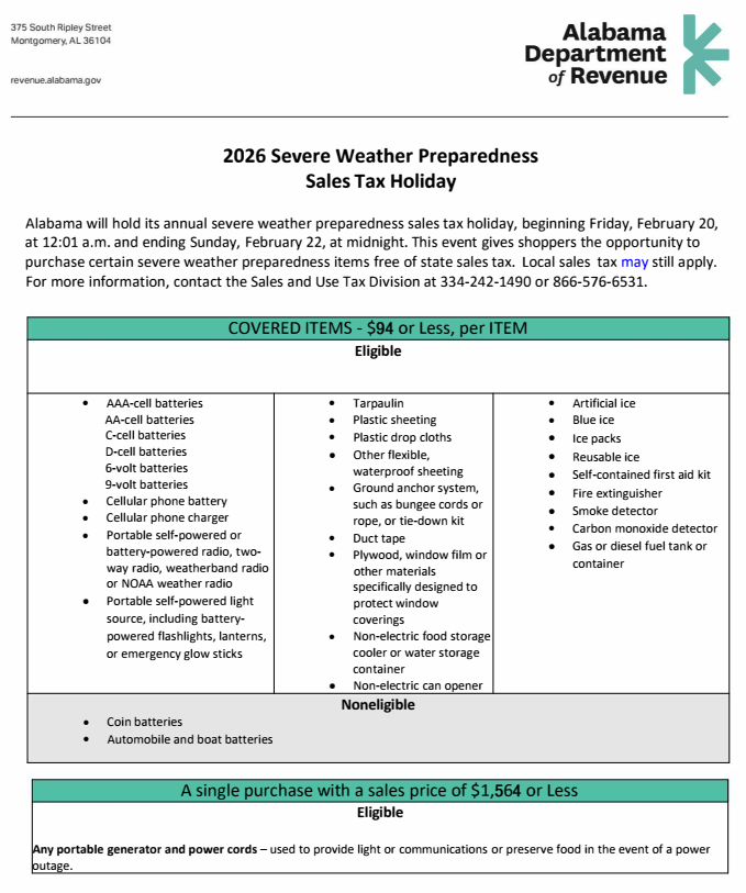 Alabama Sales Tax Holiday: February 20-22, 2026