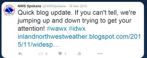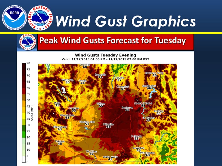 Prior to the windstorm, Meteorologists took to the Inland Northwest Weather Blog to update and further enhance the message. The high confidence for this historic wind event allowed Forecasters and Meteorologists to utilize every tool available. You can read the Blog post here:Widespread Damaging Wind Storm Tuesday Nov 17 2015.
