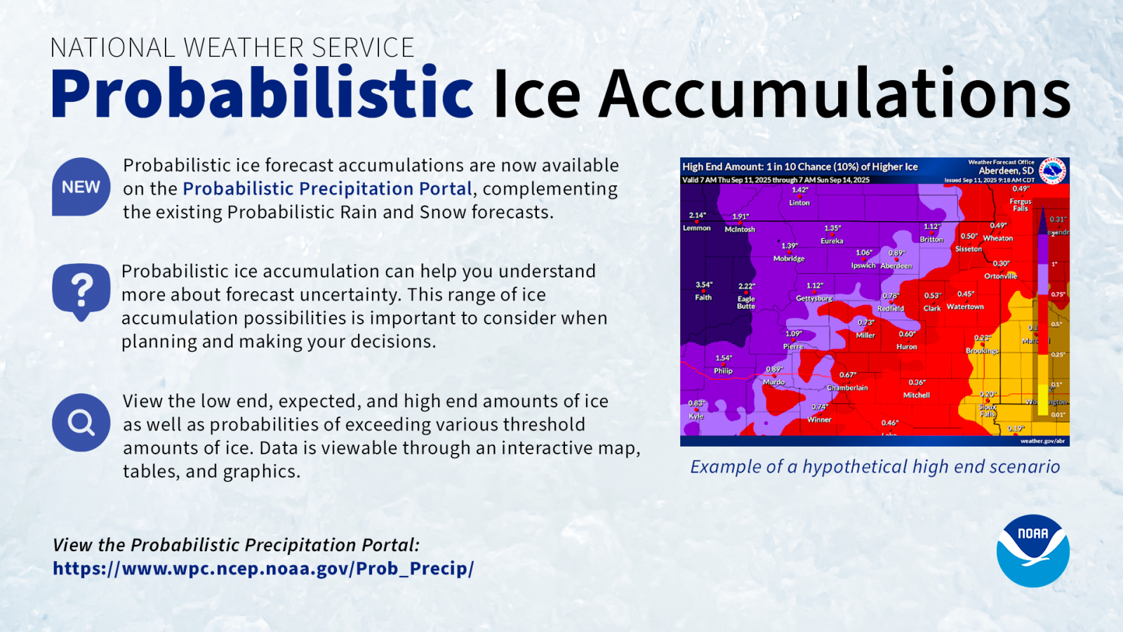 Probabilistic snowfall products are intended to provide a range of snowfall possibilities. These products complement the existing NWS forecast in order to better communicate forecast uncertainty and enhance Impact-based Decision Support Services (IDSS) before and during winter weather events.