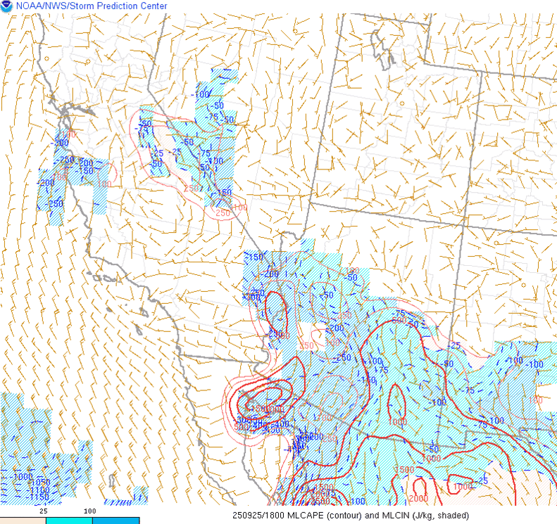Fig. 20: Animation loop of the Mixed Layer Convective Available Potential Energy (MLCAPE) AND Mixed Layer Convective Inhibition (MLCIN) between 11 AM MST Sep 25th and 5 PM MST Sep 27th, 2025