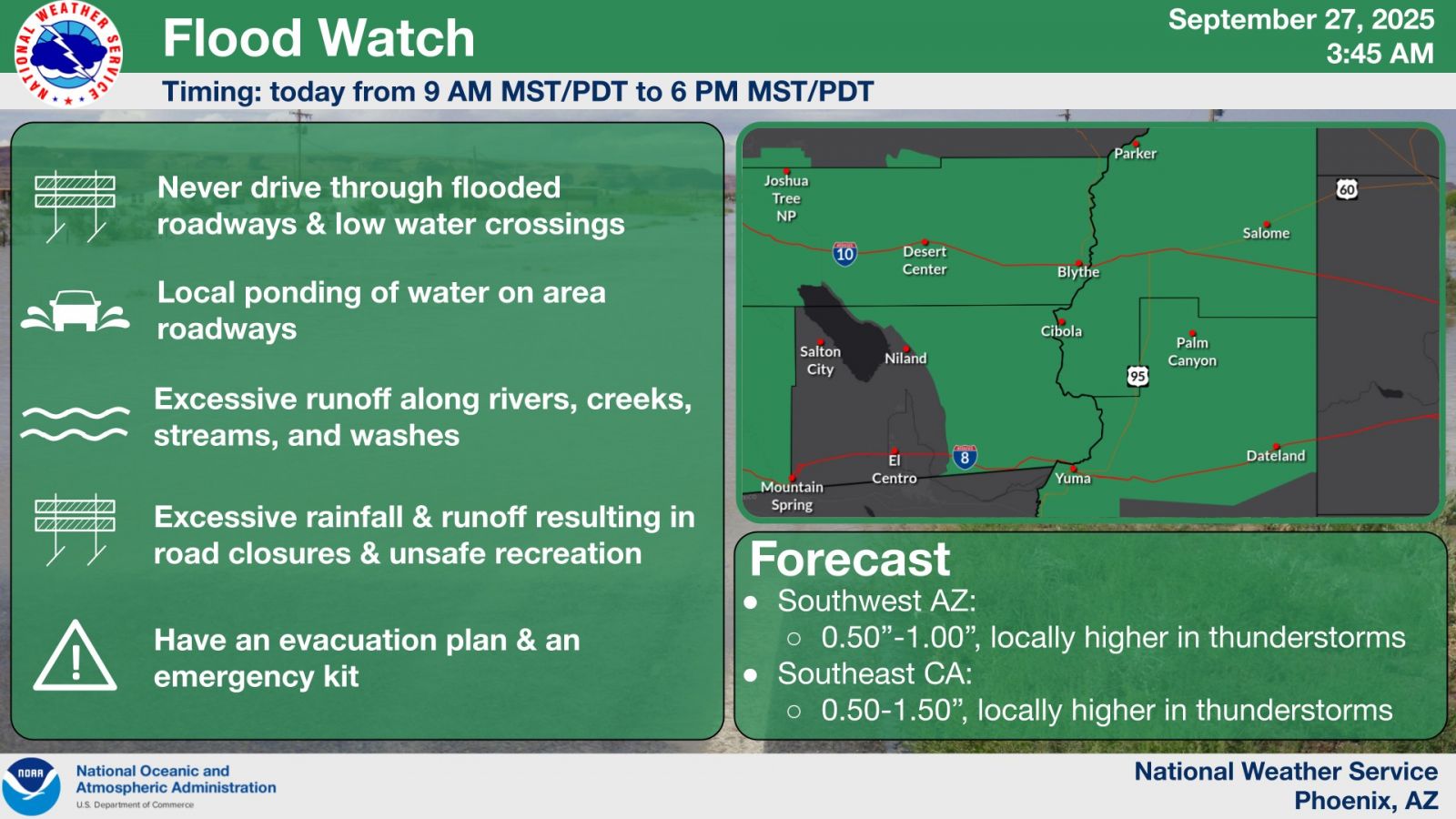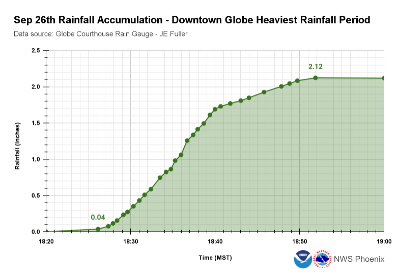 Additional shower and thunderstorm activity materialized on Saturday, September 27th, with activity this time developing further west across portions of southeast CA through southwest AZ during the morning and early afternoon hours. Although impacts with the rainfall activity were not as significant, there were some isolated flash flood incidents. Additional activity did develop across south-central AZ as well, including across portions of the Phoenix area, during the afternoon hours. Coverage was more isolated compared to the previous day, but the storms still produced additional flash flooding and severe winds gusts. Another thunderstorm cell once again moved through the already flood ravaged area of Globe/Miami in the afternoon. Despite rainfall amounts remaining under an inch with this storm, due to quick storm motion, flash flooding occurred once again in the area, exacerbated by the very saturated soils from rainfall the previous two days. US 60 in Miami became impassable, along with other reports of inundated low-water crossings.