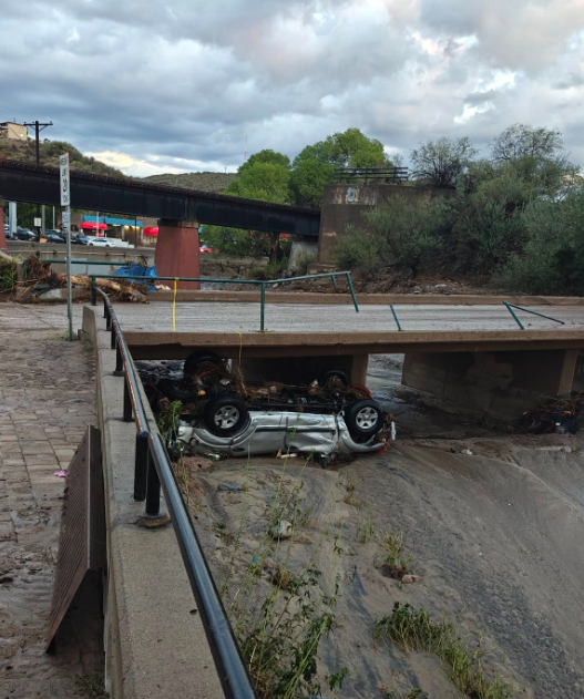 Fig. 17-18: Images of the catastrophic flooding and aftermath in Globe. Left image: Image of cars submerged and floating away from the floodwaters in Downtown Globe (Denise Holmes on Facebook); Right image: Image of the aftermath showing a car tangled up below a bridge over Pinal Creek in Downtown Globe the morning after (Greg Bucher on Facebook).