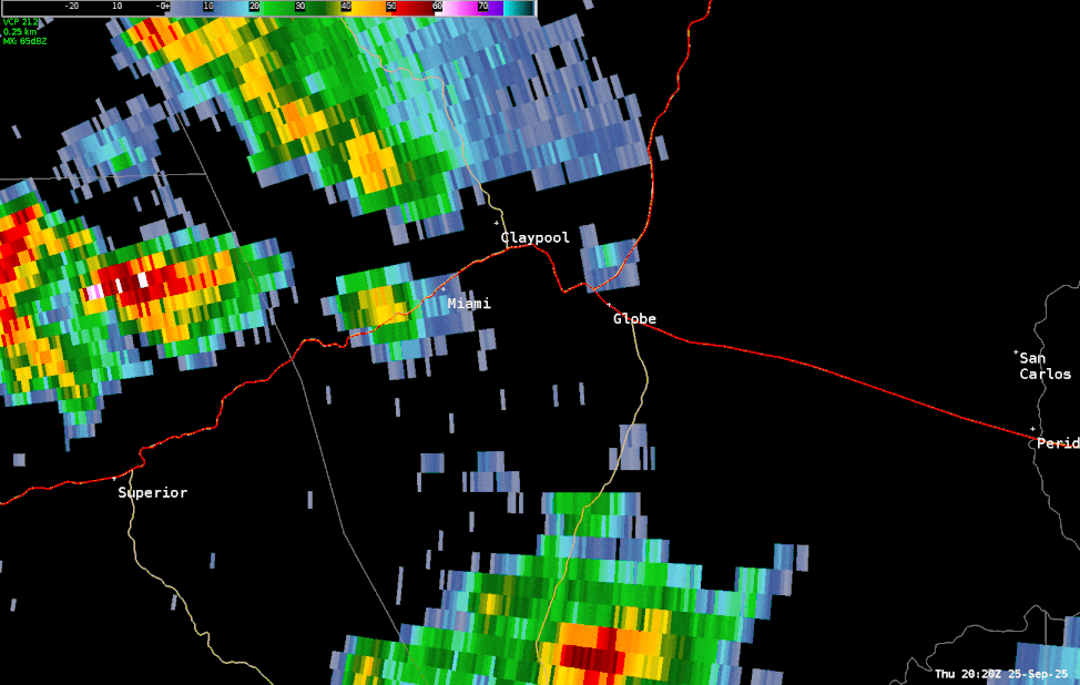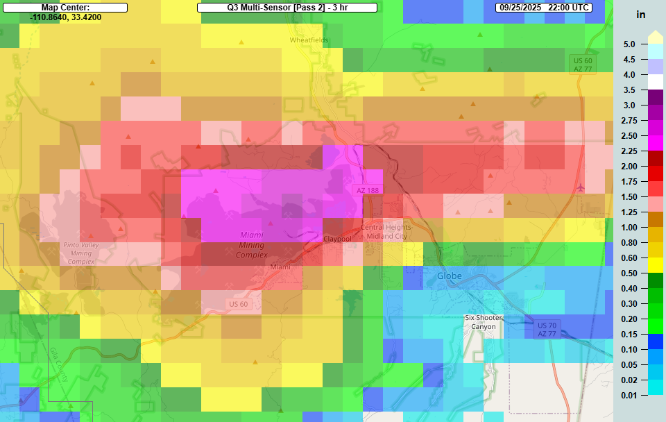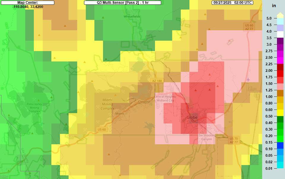 A slow-moving low pressure system brought several rounds of showers and thunderstorms through much of Arizona into southern CA between September 25-27, 2025 (Figure 1). The impacts included localized wind damage and large hail along with widespread heavy rainfall leading to numerous instances of flash flooding, which unfortunately led to loss of life. The impacts from this storm system began during the afternoon hours on Thursday, September 25, when strong to severe thunderstorms developed across the higher terrain areas of eastern AZ. A cluster of thunderstorms developed across southern Gila County and affected the Globe/Miami area with very heavy rainfall (Figure 2). Radar estimates indicated rainfall amounts of 2-3” in the Miami area, with most of the accumulations occurring in less than one hour (Figure 3). This amount of rain in such a short timespan led to significant flash flooding in the Miami area (Figure 4-5).