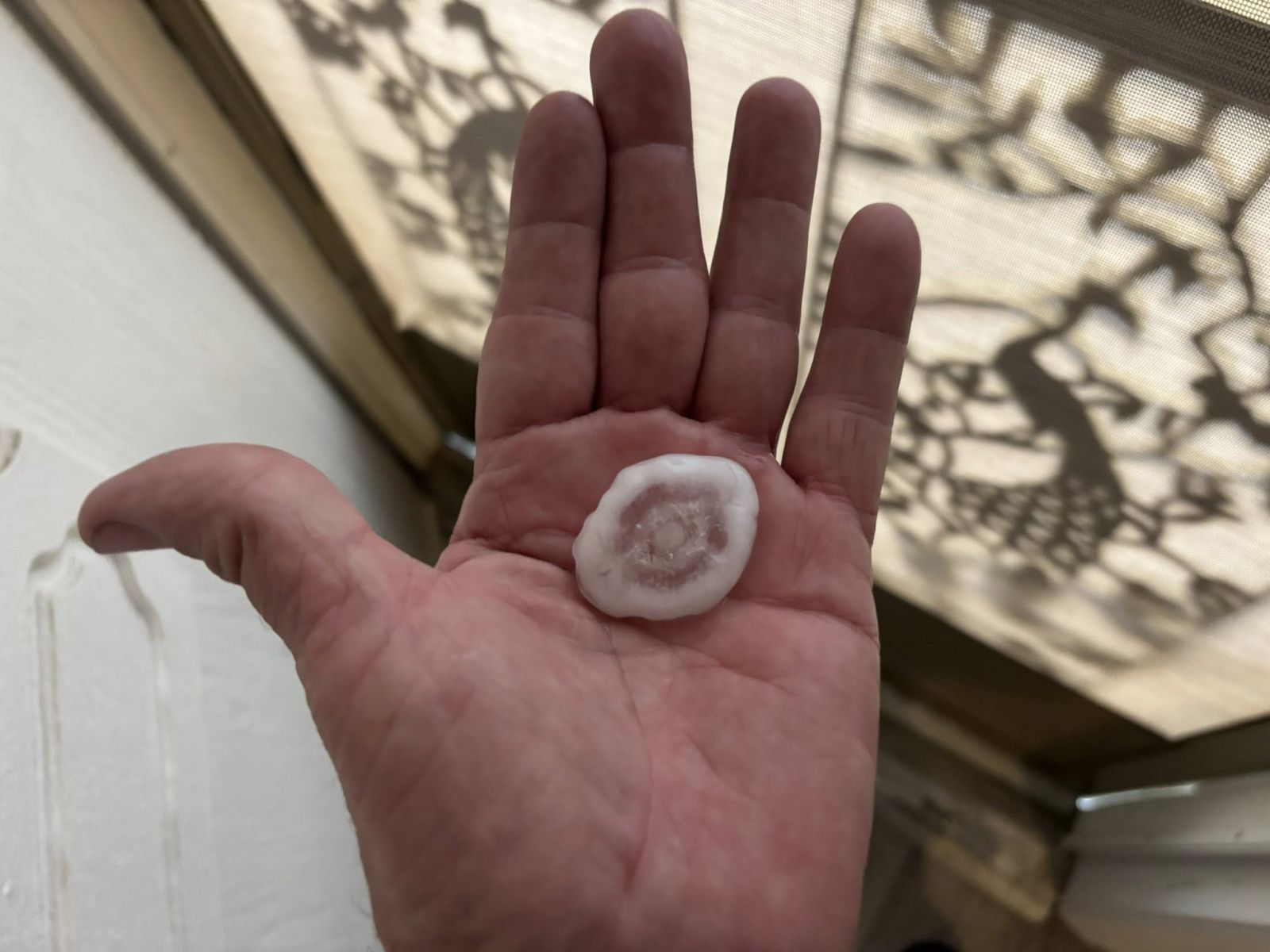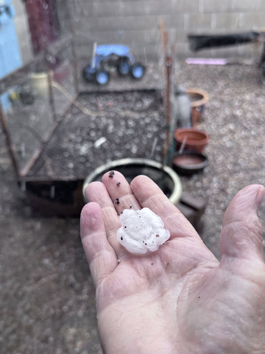 Fig. 7-8: Images of the large hail (estimated 1-1.5” diameter) in the Phoenix metro. Left image: Hail in Peoria (Tony Webb on Facebook); Right image: Hail in Sun City (Michelle Cook-Anderson on Facebook)