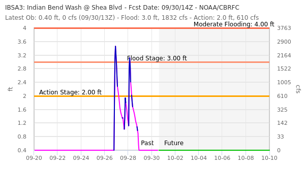 The most significant and widespread impacts from this storm system occurred on the following day, Friday, September 26th, when widespread thunderstorm activity was observed across much of south-central AZ, including the majority of the Phoenix metro area (Figure 6). Scattered thunderstorms quickly developed in the Phoenix area during the mid-morning hours with the overall areal coverage increasing heading into the early afternoon hours. Most of the storm reports that were received initially were for large hail in excess of 1” along with localized wind damage (Figures 7-8). Then, as the coverage became more widespread, the overall impacts quickly shifted into flash flooding, with numerous reports of water rescues as a result of vehicles stuck in floodwaters along local highways and streets, and washes overflowing causing low-water crossings to become impassable (Figures 9-10). Indian Bend Wash, which runs through the city of Scottsdale, had significant flooding with water levels rising to flood stage near Shea Boulevard (Figure 11). There were several reports of vehicles trapped and submerged under the flood waters (Figure 12) . One of the vehicles submerged unfortunately claimed the life of one person. When the rainfall was all said and done by the early evening hours, 1.00-2.50”, with localized amounts in excess of 2.50”, were measured across a vast portion of the Phoenix area. Phoenix Sky Harbor Airport received 1.64” of rain, which was the highest one-day rainfall since October 13, 2018, when 2.19” was measured (Figure 13).