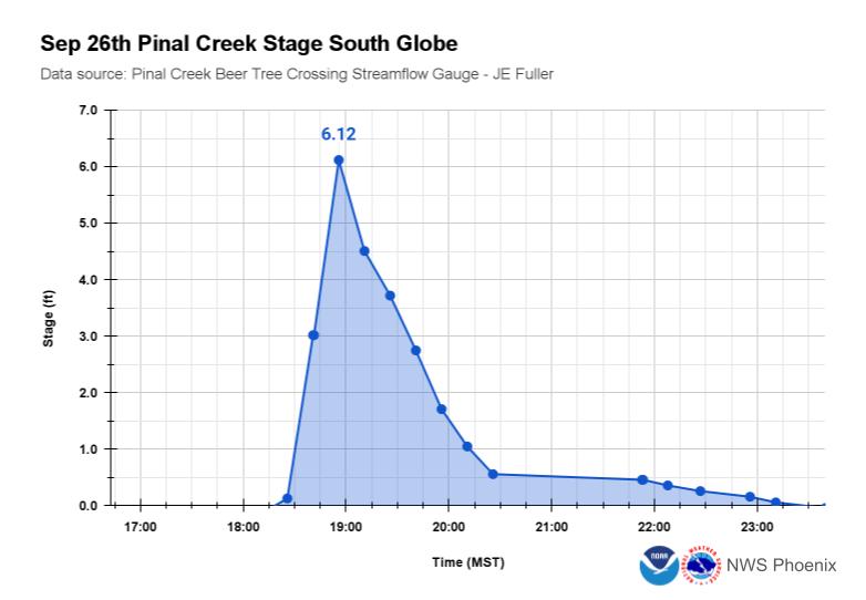 A few hours after the rainfall dissipated in the Phoenix area, a new area of strong to severe thunderstorms with very heavy rainfall once again moved eastward into southern Gila County, affecting the Globe/Miami area for a second time in just over 24 hours (Figure 6). Gauge reports and doppler radar estimates out of the Globe area measured approximately 2” of rain, with most of the rain occurring in less than 30 minutes (Figure 14-15). A stream gauge along Pinal Creek, just south of downtown Globe, reported a 6 foot water rise in 30 minutes between 6:25 PM and 6:55 PM MST (Figure 16). Subsequently, videos and images emerged from downtown Globe depicting catastrophic flooding as the flood wave in Pinal Creek overtopped bridges, inundated businesses, and flooded or swept away numerous vehicles (Figures 17-18). Around 800 propane tanks were also swept into the floodwaters from a nearby distribution center. Unfortunately, the flooding claimed three lives. A State of Emergency was declared for Globe by Globe’s Mayor, Al Gameros, on the afternoon of September 27th with an Arizona State of Emergency declared shortly after by AZ Governor Hobbs.