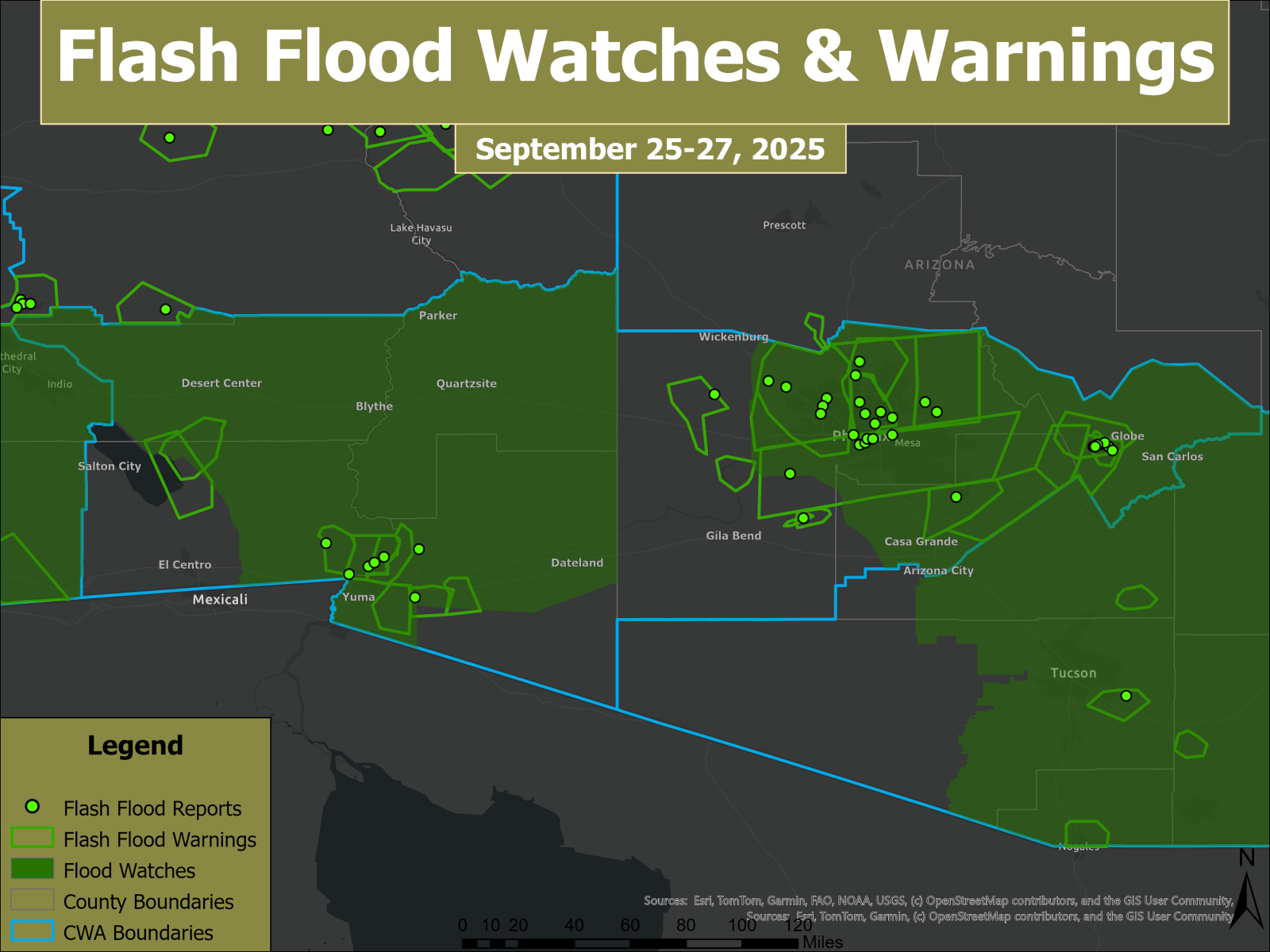 Fig. 27: Spatial extent of the Flood Watches and Flash Flood Warnings issued by the NWS Offices in Phoenix, Flagstaff, Tucson, and Las Vegas on Sep 25-27th, 2025, with locations of flash flood reports indicated with green dots.