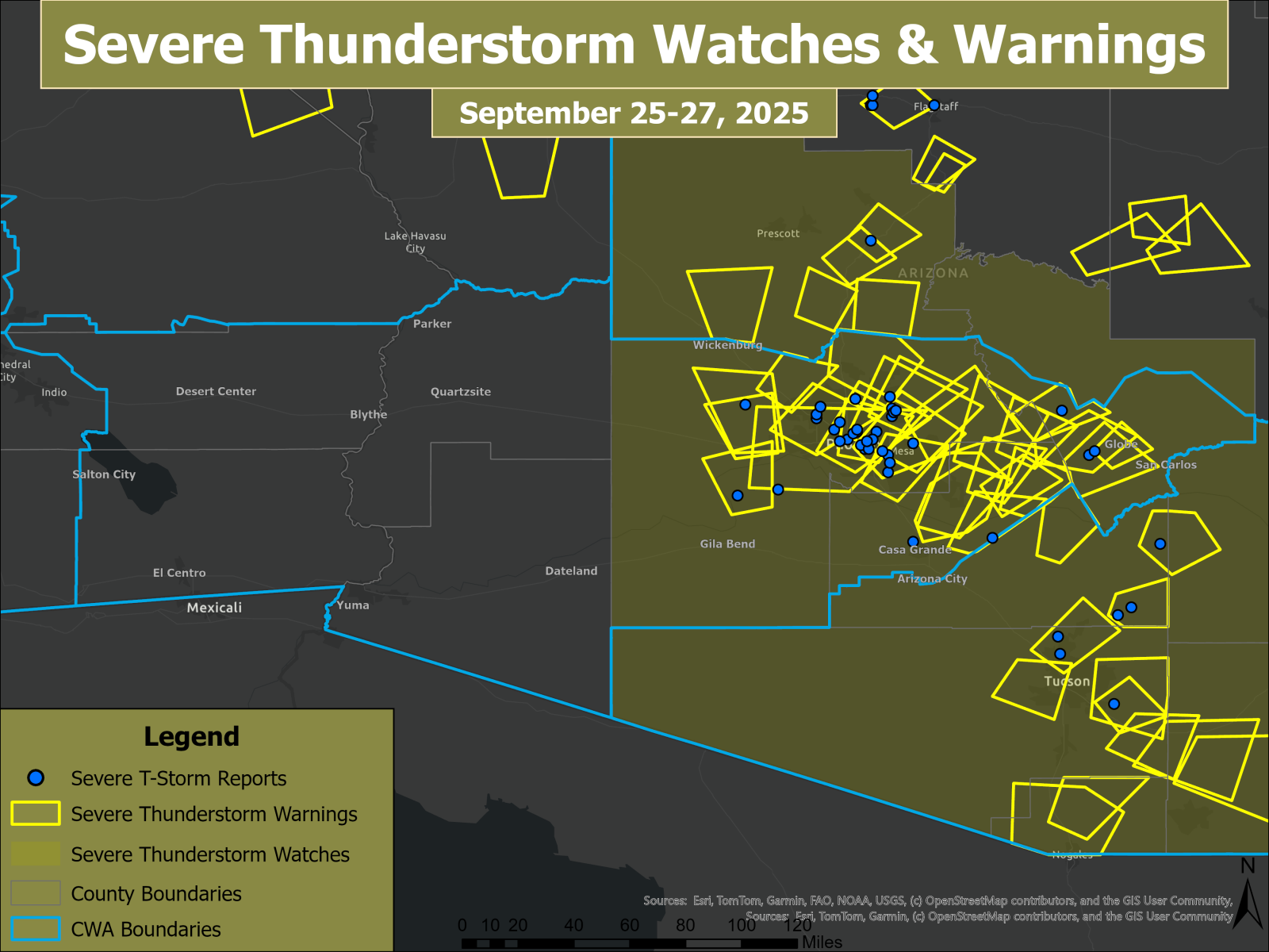 Fig. 28: Spatial extent of the Severe Thunderstorm Watch and Warnings issued by the Storm Prediction Center and NWS Offices in Phoenix, Flagstaff, Tucson and Las Vegas on September 25-27, 2025. Locations of thunderstorm wind damage/severe gusts (wind gusts ≥ 58 mph) reports are noted with the blue dots.