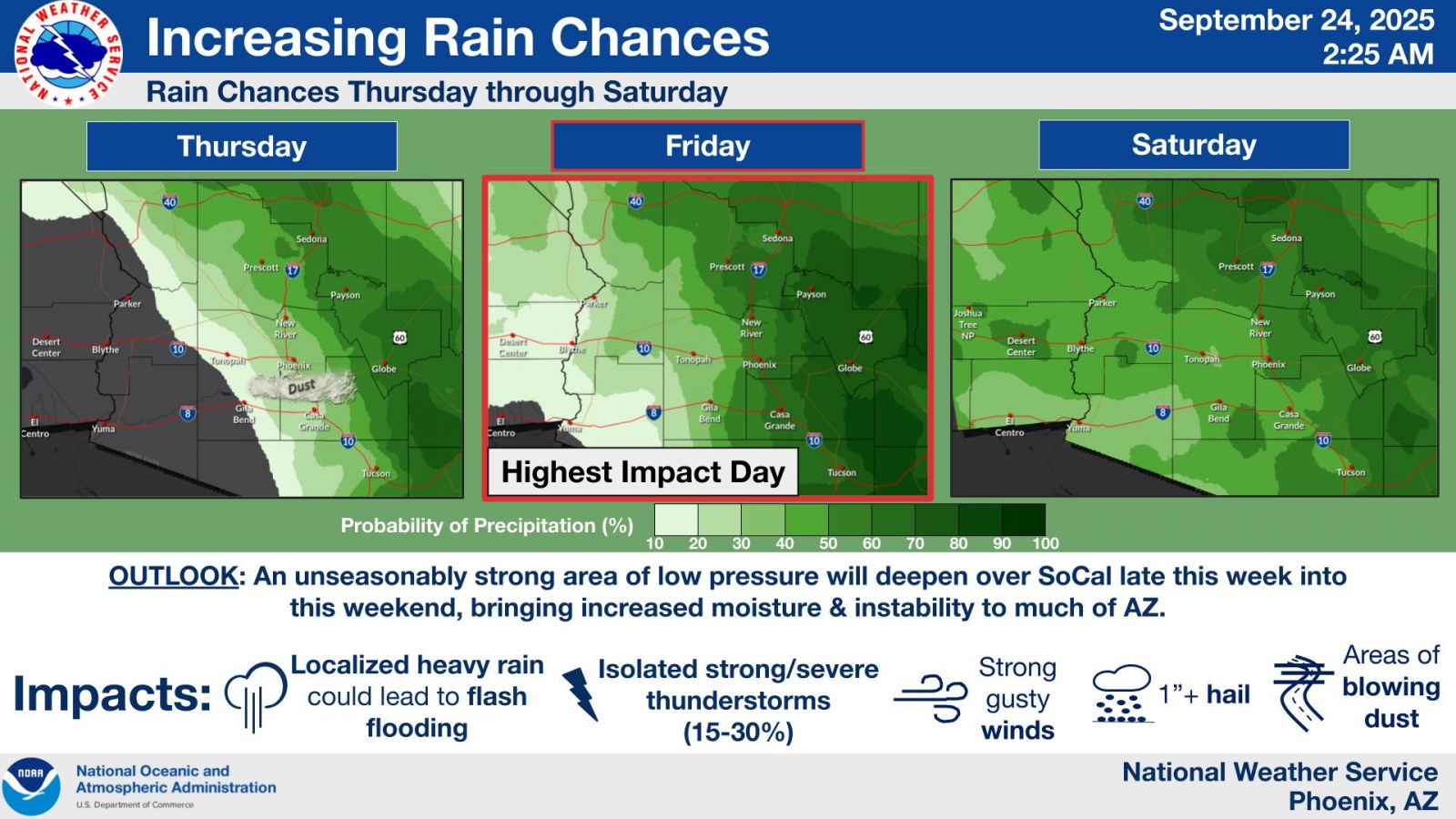 NWS Phoenix began highlighting the potential for a high impact event starting on Monday, September 22 with a weather story graphic that was posted on the weather.gov/psr webpage and social media highlighting the potential for strong thunderstorms by the end of the week (Figure 23). As the event drew closer and confidence increased, another weather story graphic with more detailed information about the timing and expected impacts from the rain and thunderstorm activity was published (Figure 24).