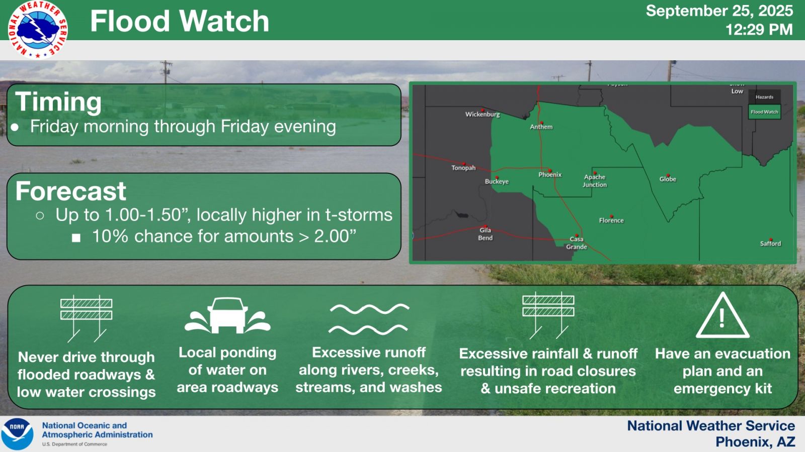 Fig. 25-26: Top Image: Weather story graphic highlighting the Flood Watch issued for the Phoenix metro and points south and east; Bottom Image: Weather Story graphic highlighting the Flood Watch issued for portions of southeast CA and southwest AZ.