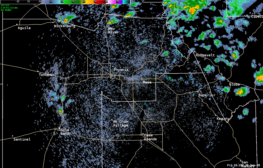 Fig. 6: Reflectivity loop from 8:15 AM to 8:47 PM MST on Sep 26th, 2025 from the KIWA (Phoenix, AZ) radar
