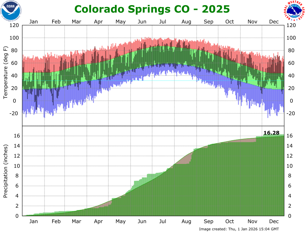 The 2025 average temperature in Colorado Springs was 51.5 degrees. This is 1.1 degrees above normal and makes 2025 the 9th warmest year on record in Colorado Springs, well behind the average yearly temperature of 52.9F in 2012. Colorado Springs recorded 16.25 inches of precipitation in 2025. This is 0.37 inches above normal and makes 2025 the 46th wettest year on record in Colorado Springs. Colorado Springs tallied 27.5 inches of snow in 2025. This is 5.0 inches below normal and makes 2025 the 34th least snowiest year on record. A more detailed 2025 climate summary for Colorado Springs can be found at: