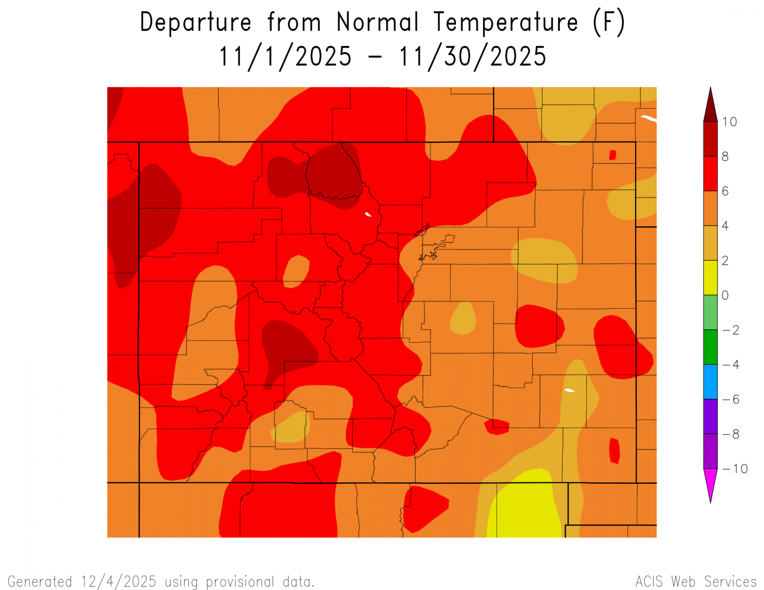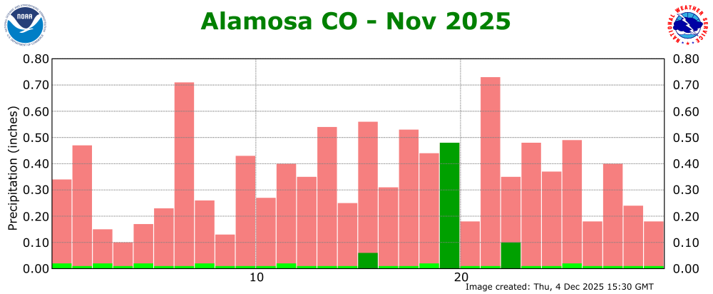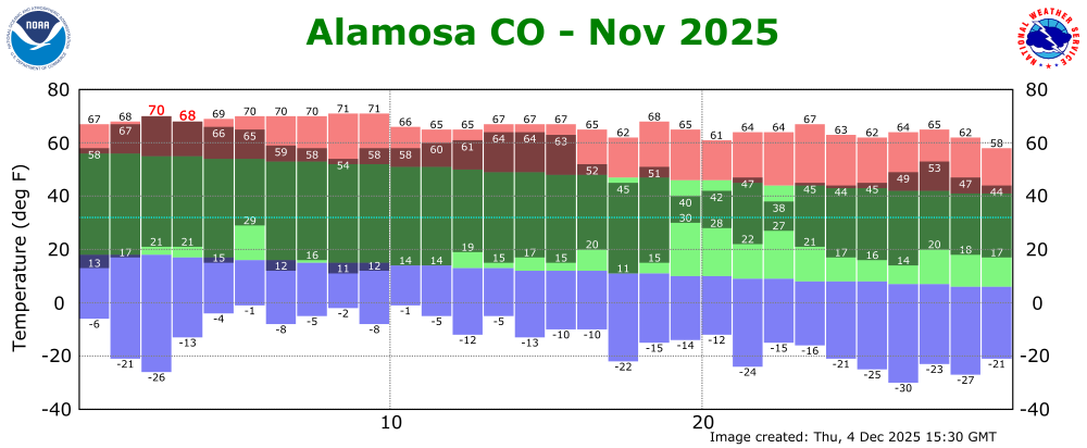 The preliminary average temperature in Alamosa for the past month of November was 36.2 degrees. This is 5.9 degrees above normal and makes November of 2025 the 2nd warmest November on record In Alamosa, just behind November of 2017, when the average monthly temperature was 38.4 degrees. The average November maximum temperature in Alamosa was 54.6 degrees, which is 6.0 degrees above normal. The average November minimum temperature in Alamosa was 17.9 degrees, which is 5.8 degrees above normal. Alamosa recorded 0.64 inches of precipitation through the month of November. This is 0.27 inches above normal and makes November of 2025 the 16th wettest November on record. This is remains below the wettest November of 2013 when 1.36 inches of precipitation was recorded in Alamosa. Alamosa recorded 0.5 inches of snow in November, which is 2.9 inches below normal. Alamosa set two daily record high temperatures and a daily record rainfall through the past month of November. (ALS POR: 1932-2025)