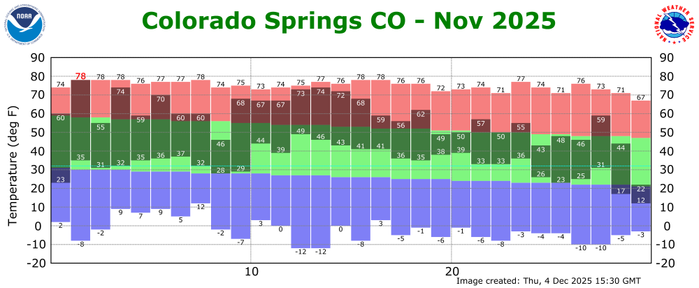 The preliminary average temperature in Colorado Springs for the past month of November was 45.9 degrees. This is 6.4 degrees above normal and makes November of 2025 tied with November of 2021 as the 2nd warmest November on record, which is just behind the warmest November of 1949, when the average monthly temperature was 47.4 degrees. The average November maximum temperature in Colorado Springs was 58.4 degrees, which is 5.5 degrees above normal. The average November minimum temperature in Colorado Springs was 33.5 degrees, which is 7.5 degrees above normal. Colorado Springs recorded 1.20 inches of precipitation through the month of November. This is 0.83 inches above normal and makes November of 2025 the 9th wettest November on record, well behind of the wettest November of 1909, when 2.30 inches of precipitation was recorded in Colorado Springs. Colorado Springs recorded 0.3 inches of snow in November, which is 4.1 inches below normal. Colorado Springs set a daily record high of 78 degrees on November 2nd, which also ties the monthly record high temperature of 78 degrees set in November of 1924, 1981, 2006, 2016, and 2020. Colorado Springs also set 2 daily record high minimum temperatures in November. Colorado Springs also set a record daily rainfall of 1.10 on November 23rd, which also sets a new record rainfall for the month of November, surpassing the 1.07 inches recorded on November 4th of 1946. Also, the 0.3 inches of snow recorded on November 30th becomes the 4th latest first measurable snowfall on record in Colorado Springs, behind December 31st, 2021, December 23rd, 1939 and December 2nd, 2016. (COS POR: 1894-2025)