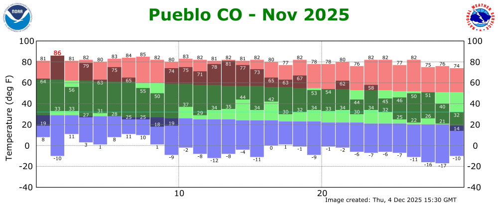 The preliminary average temperature in Pueblo for the past month of November was 45.5 degrees. This is 5.0 degrees above normal and makes November of 2025 the 8th warmest November record in Pueblo. This remains well behind the warmest November of 1949, when the average November temperature was 47.4 degrees. The average November maximum temperature in Pueblo was 61.7 degrees, which is 5.0 degrees above normal. The average November minimum temperature in Pueblo was 29.3 degrees, which is 5.1 degrees above normal. Pueblo recorded 0.63 inches of precipitation through the month of November. This is 0.16 inches above normal and makes November of 2025 the 30th wettest November on record. This remains well behind the wettest November of 2024 when 2.51 inches of precipitation was recorded in Pueblo. Pueblo recorded 0.7 inches of snow in November, which is 3.4 inches below normal. Pueblo set a new daily record high temperature of 86 degrees on November 2nd, crushing the previous record of 81F set in 2008. The 86 degrees on November 2nd also sets a new record monthly high temperature in Pueblo, surpassing the 85 degrees set on November 8th of 2006. (PUB POR: 1888-2025)