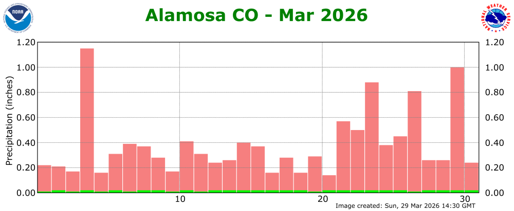 The preliminary average temperature in Alamosa for the past month of March was 43.8 degrees. This is 8.6 degrees above normal and makes March of 2026 the warmest March on record In Alamosa, crushing the previous warmest March of 2017, when the average temperature was 40.9 degrees. The average March maximum temperature in Alamosa was 66.6 degrees, which is 13.9 degrees above normal. The average March minimum temperature in Alamosa was 20.9 degrees, which is 3.3 degrees above normal. Alamosa recorded a trace of precipitation through the month of March. This is 0.54 inches below normal and makes March of 2026 tied with March of 1955 as the driest March on record. The high temperature reached 80F or greater twice in the month of March. This has never happened before, with the previous earliest 80F temperature on record being April 20th, of 1989. Alamosa set or tied 15 record high temperatures in the month of March, including the highest March temperature on record of 83F on the 21st. (ALS POR: 1932-2026)
