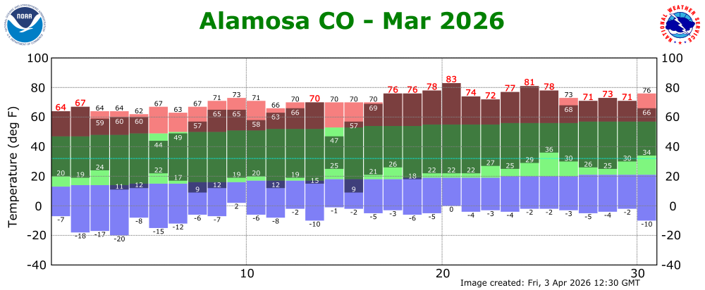 The preliminary average temperature in Alamosa for the past month of March was 43.9 degrees. This is 8.7 degrees above normal and makes March of 2026 the warmest March on record In Alamosa, crushing the previous warmest March of 2017, when the average temperature was 40.9 degrees. The average March maximum temperature in Alamosa was 66.6 degrees, which is 13.9 degrees above normal. The average March minimum temperature in Alamosa was 21.2 degrees, which is 3.6 degrees above normal. Alamosa recorded a trace of precipitation through the month of March. This is 0.54 inches below normal and makes March of 2026 tied with March of 1955 as the driest March on record. The high temperature reached 80F or greater twice in the month of March. This has never happened before, with the previous earliest 80F temperature on record being April 20th, of 1989. Alamosa set or tied 15 record high temperatures in the month of March, including the highest March temperature on record of 83F on the 21st. (ALS POR: 1932-2026)