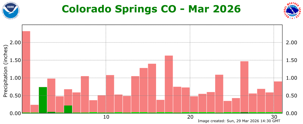 The preliminary average temperature in Colorado Springs for the past month of March was 50.9 degrees. This is 9.8F above normal and makes March of 2026 the warmest March on record, crushing the previous warmest March of 2012 when the average temperature was 48.0F. The average March maximum temperature in Colorado Springs was 66.1 degrees, which is 11.2 degrees above normal. The average March minimum temperature in Colorado Springs was 35.7 degrees, which is 8.4 degrees above normal. Colorado Springs recorded 1.03 inches of precipitation throughout the month of March. This is 0.24 inches above normal and makes March of 2026 tied as 35th wettest March on record. Colorado Springs saw 3.0 inches of snow in the month of March. This is 2.7 inches below normal and makes March of 2026 tied as the 32nd least snowiest March on record. The temperature topped out at 80F or greater six times throughout March of 2026 in Colorado Springs. In the previous 131 years of records, the temperature reached 80F only six other times in the month of March in Colorado Springs (2X 2017, 1X 2022, 1X 2015, 1X 1971, 1X 2963). Colorado Springs set or tied 8 record high temperatures in March, including the warmest March temperature on record of 86F on the 21st, as well as one daily record precipitation on March 3rd, when 0.74 inches was recorded. (COS POR: 1895-2026)