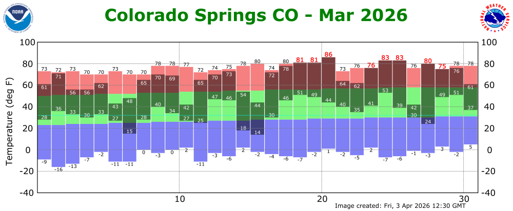 The preliminary average temperature in Colorado Springs for the past month of March was 50.8 degrees. This is 9.7F above normal and makes March of 2026 the warmest March on record, crushing the previous warmest March of 2012 when the average temperature was 48.0F. The average March maximum temperature in Colorado Springs was 66.1 degrees, which is 11.2 degrees above normal. The average March minimum temperature in Colorado Springs was 35.5 degrees, which is 8.2 degrees above normal. Colorado Springs recorded 1.03 inches of precipitation throughout the month of March. This is 0.24 inches above normal and makes March of 2026 tied as 35th wettest March on record. Colorado Springs saw 3.0 inches of snow in the month of March. This is 2.7 inches below normal and makes March of 2026 tied as the 32nd least snowiest March on record. The temperature topped out at 80F or greater six times throughout March of 2026 in Colorado Springs. In the previous 131 years of records, the temperature reached 80F only six other times in the month of March in Colorado Springs (2X 2017, 1X 2022, 1X 2015, 1X 1971, 1X 2963). Colorado Springs set or tied 8 record high temperatures in March, including the warmest March temperature on record of 86F on the 21st, as well as one daily record precipitation on March 3rd, when 0.74 inches was recorded. (COS POR: 1895-2026)