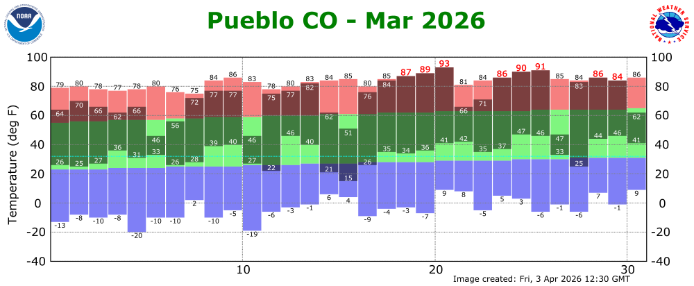 The preliminary average temperature in Pueblo for the past month of February was 53.1 degrees. This is 9.2 degrees above normal and makes March of 2026 the warmest on record, besting the previous warmest March of 1910, when the average temperature was 51.3F. The average March maximum temperature in Pueblo was 72.4 degrees, which is 11.8 degrees above normal. The average March minimum temperature in Pueblo was 33.9 degrees, which is 6.8 degrees above normal. Pueblo recorded 0.88 inches of precipitation throughout March. This is 0.06 inches above normal and makes March of 2026 tied as the 44th wettest March on record. Pueblo recorded a trace of snow in March, which is 4.5 inches below normal. The high temperature reached 90F or greater 3 times in March of 2026 in Pueblo. This has never happened before, with the previous earliest 90F temperature on record in Pueblo being April 6th, of 1991. Pueblo set or tied 8 record high temperatures in the month of March, including the highest March temperature on record of 93F on the 21st, as well as one daily record precipitation on March 3rd, when 0.73 inches was recorded. (PUB POR: 1888-2026)