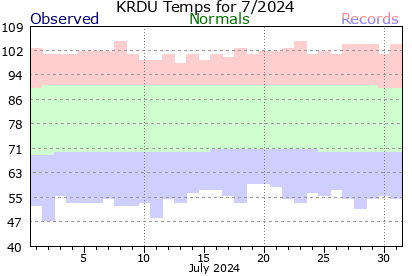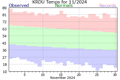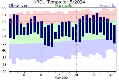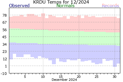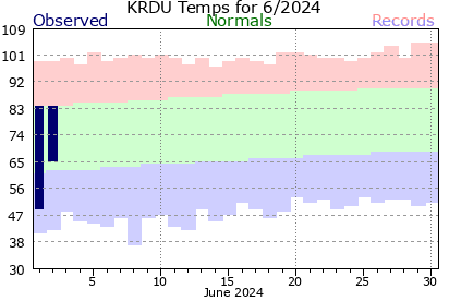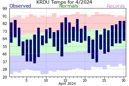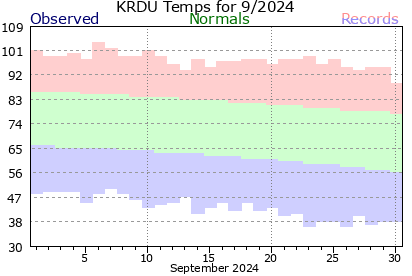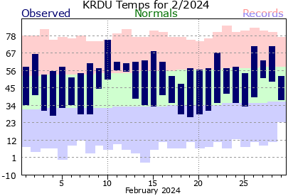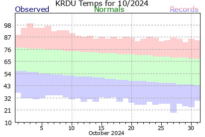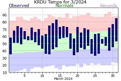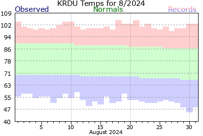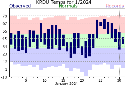 How to Read the Plots:This is an example of the monthly climate plot. The observed high and low temperatures are indicated by the tops and bottoms of the vertical blue bars, respectively. The normal temperature ranges are indicated by the green band. Record highs are shown on the top of the light pink band, and record lows are indicated along the bottom of the light blue band. |