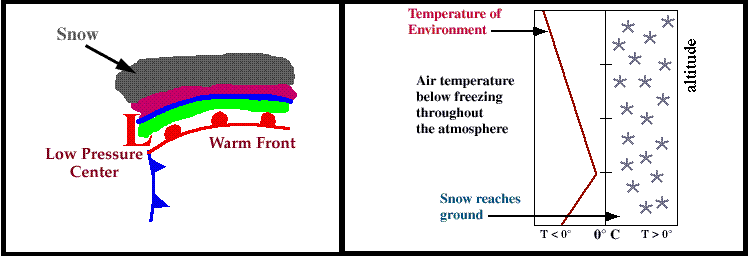 Snowflakes are simply aggregates of ice crystals that collect to each other as they fall toward the surface. The diagram shows a typical temperature profile for snow with the red line indicating the atmosphere's temperature at any given altitude. The vertical line in the center of the diagram is the freezing line. Temperatures to the left of this line are below freezing, while temperatures to the right are above freezing.
