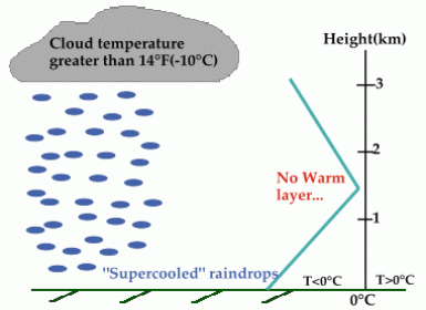 As the raindrops approach the ground, they encounter a layer of cold air and cool to temperatures below 0°C. However, since the cold layer is so shallow, the drops themselves do not freeze, a phenomena called supercooling (or forming "supercooled raindrops"). The supercooled raindrops are raindrops that are colder than 0C and freeze on contact when they strike the ground.