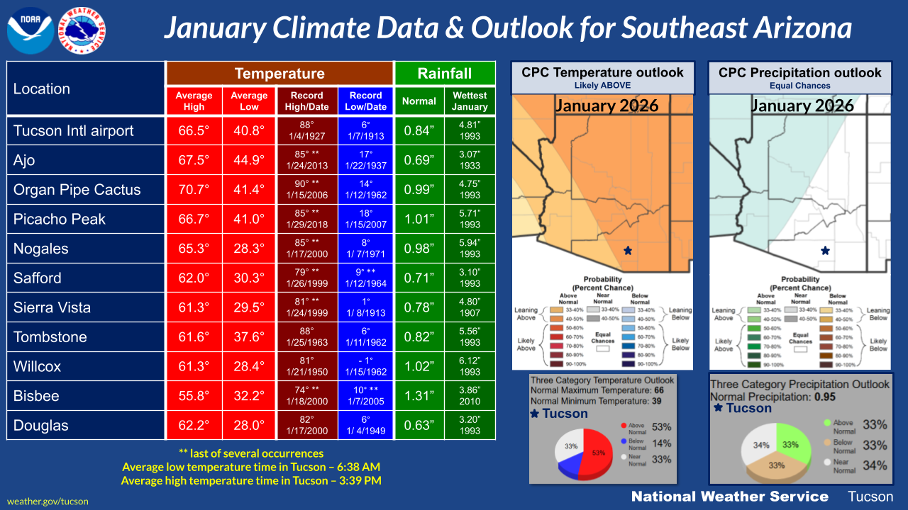 The September outlook from the Climate Prediction Center for Tucson is for equal chances for either below-, near- or above-normal monthly mean temperatures and total monthly precipitation amounts (33% above vs 33% below).