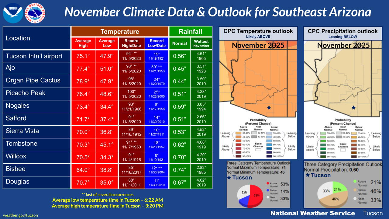 | The Fall outlook from the Climate Prediction Center for Tucson strongly favors above-normal seasonal mean temperatures (53% above vs 14% below) and favors below-normal total precipitation amounts (38% below vs 29% above). |