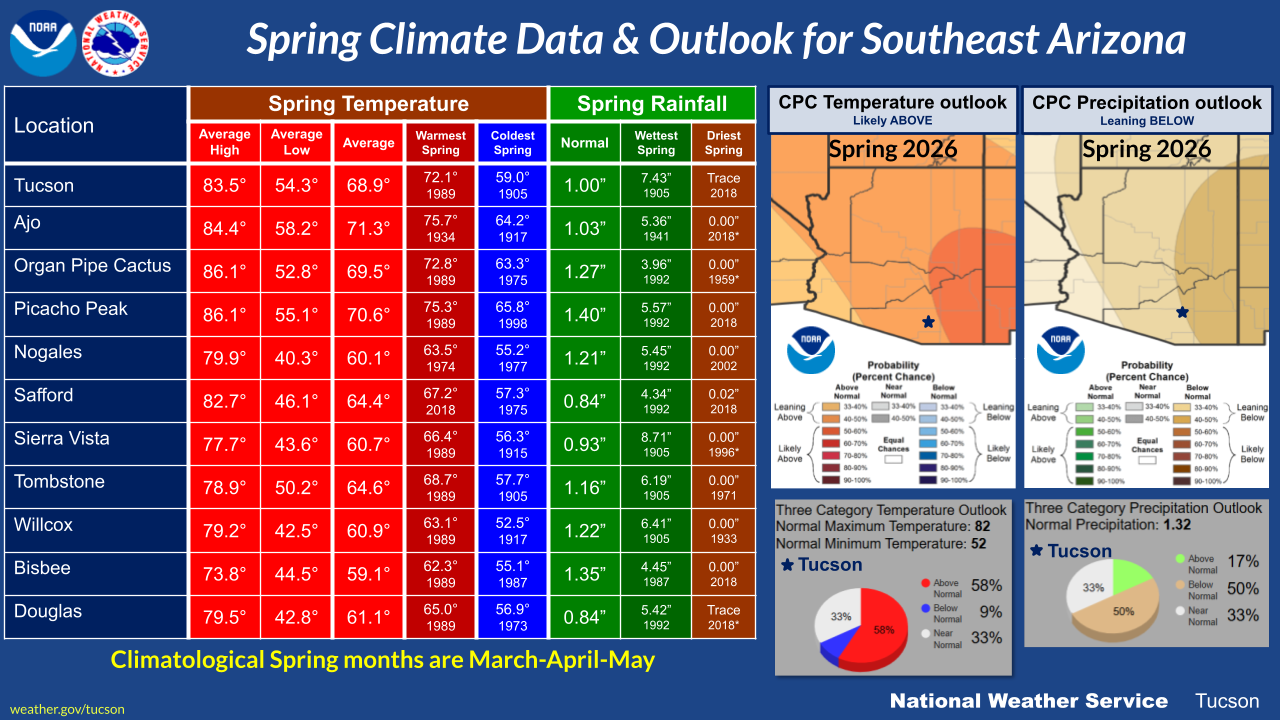 The Climate Prediction Center's Spring outlook for Tucson favors a warmer-than-average season, showing a 58% chance of above-normal seasonal mean temperatures compared to only a 9% chance of below-normal. For precipitation, the outlook favors a drier-than-average season, showing a 50% chance of below-normal seasonal total precipitation amounts compared to a 17% chance of above-normal.